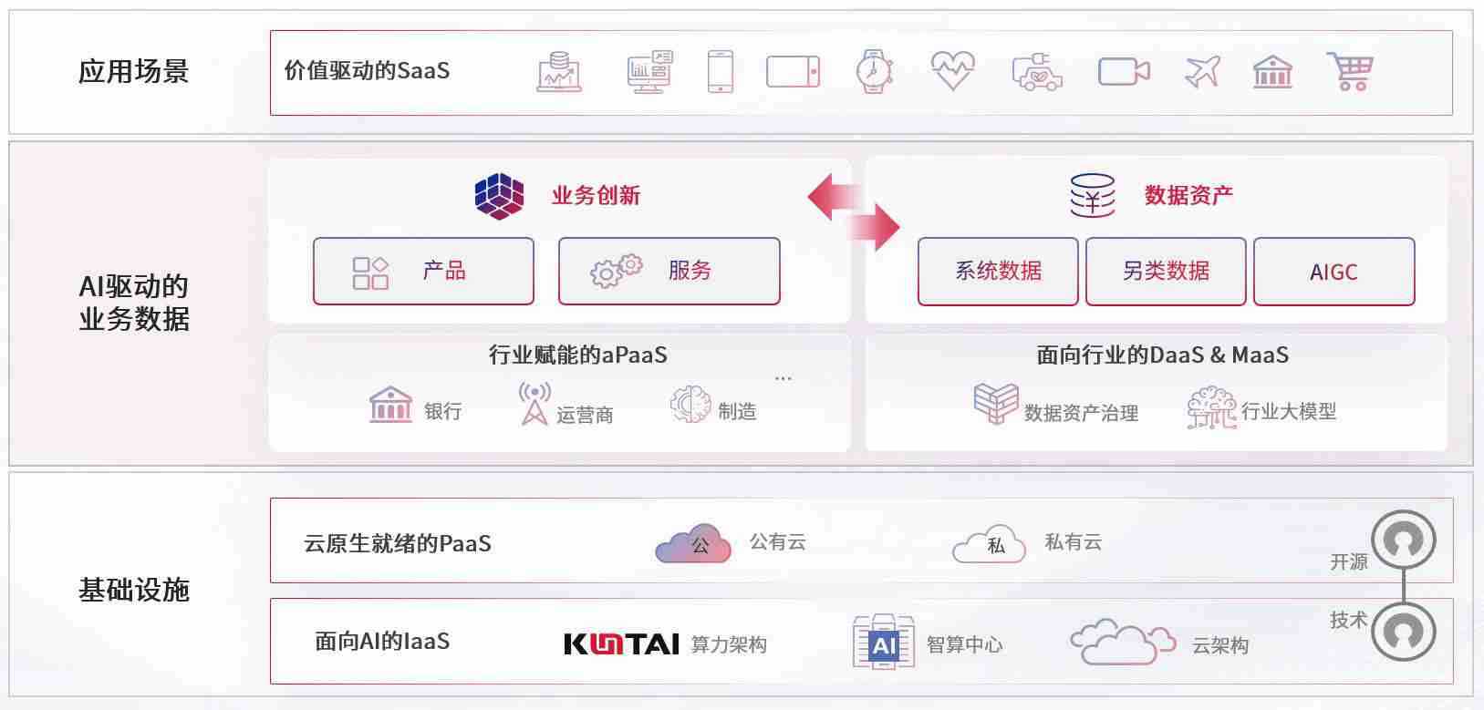 数字时代,,,围绕企业数字化转型的关键要素,,NG娱乐数码开创性的提出数云融合战略和技术体系框架,,着力在云原生、、、数字原生、、、AI原生和信创产业上架构产品和服务能力,,,为处在不同数字化转型阶段的快消零售、、汽车、、、金融、、、、医疗、、、政企、、、教育、、运营商等行业客户提供泛在的敏捷IT能力和融合的数据驱动能力,,,,构建跨界融合创新的数字业务场景和新业务模式,,助力企业级客户建立面向未来的核心能力和竞争优势,,全面推动社会的数字化、、、智能化转型升级。。